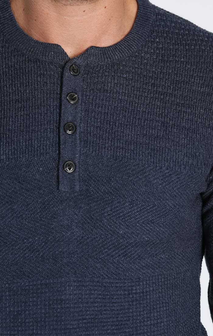 A waffled sweater in a four button long sleeve henley body with unique mixed stitch pattern.