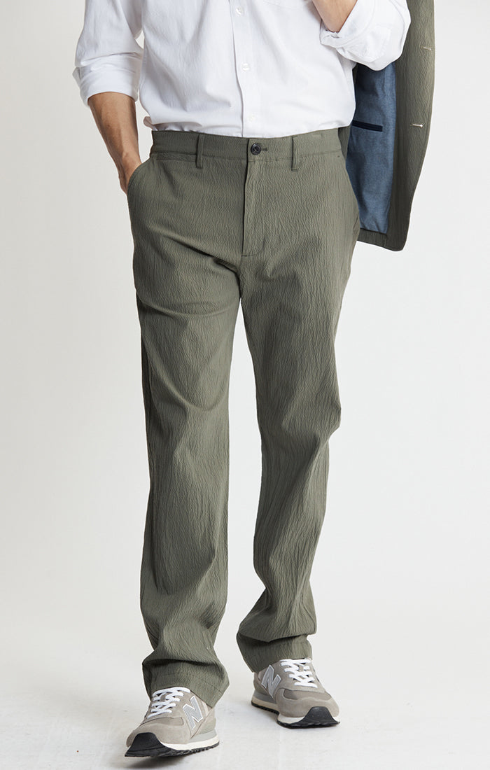 We had summer in mind while designing this pant. A lightweight seersucker fabric in a more relaxed fit makes this an ideal warm weather style.