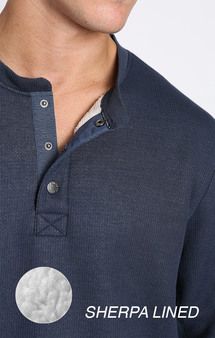 Elevate your cold‑weather wardrobe with this ultra‑cozy, style‑forward thermal henley. Designed with a classic waffle knit exterior and a plush sherpa lining, it delivers both warmth and rugged texture-perfect for cooler days at home or layered under a jacket on the go.
