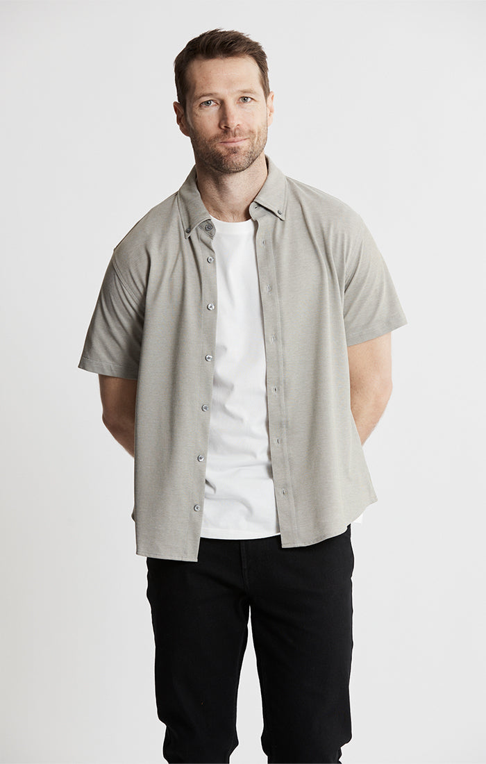 A short sleeve shirt with the look of a classic Oxford, reimagined in a soft, stretchy knit. Easy to wear, feels like your favorite t-shirt but polished enough for everyday dressing.