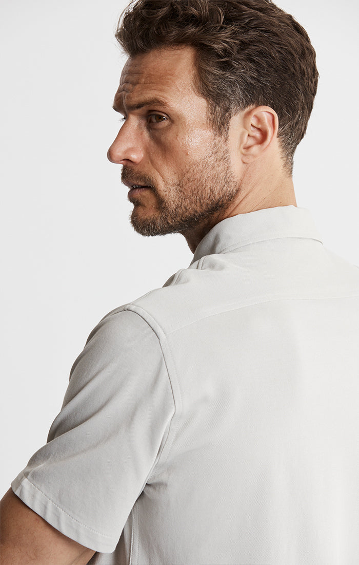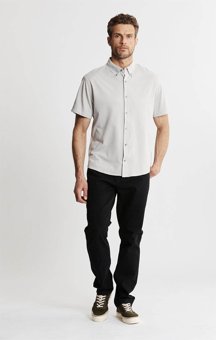 A short sleeve shirt with the look of a classic Oxford, reimagined in a soft, stretchy knit. Easy to wear, feels like your favorite t-shirt but polished enough for everyday dressing.